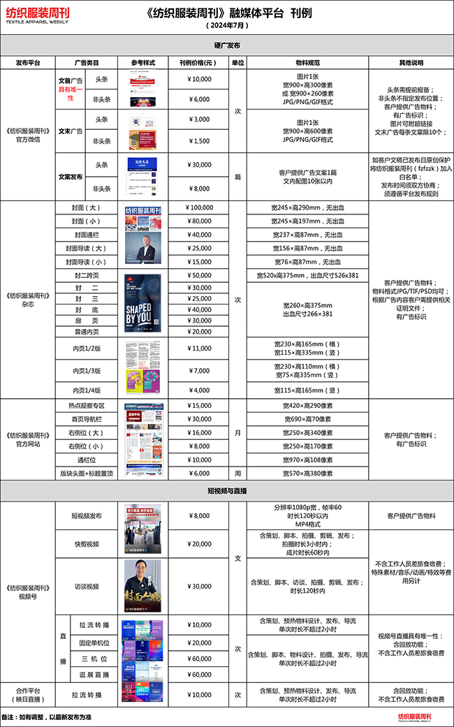 《纺织服装周刊》广告价目表