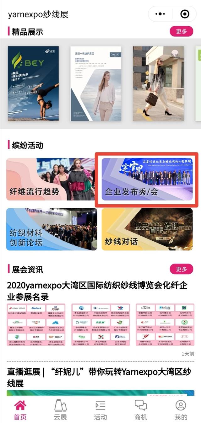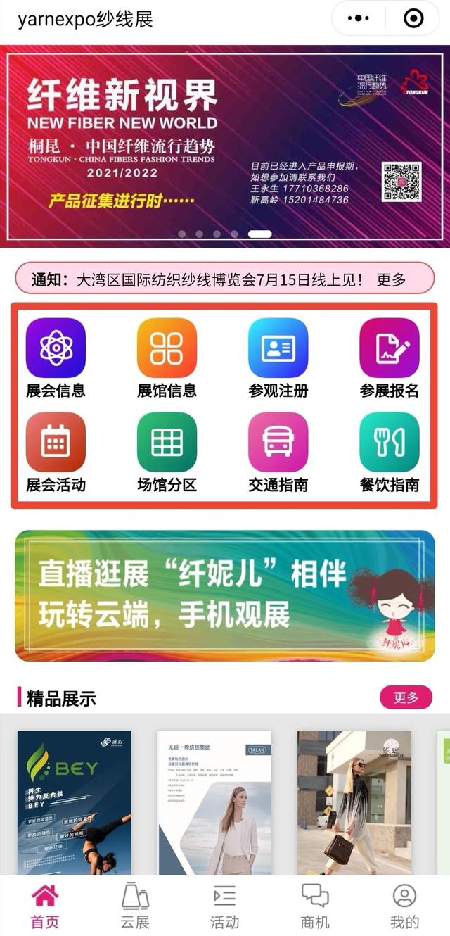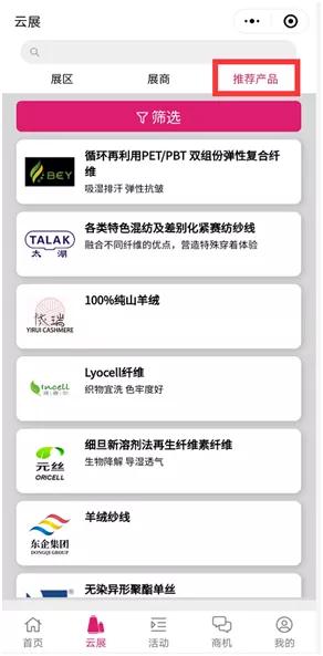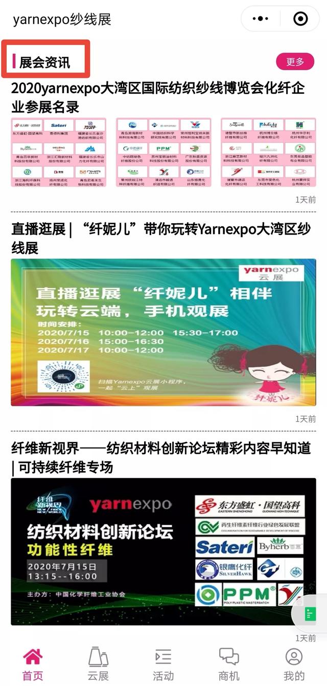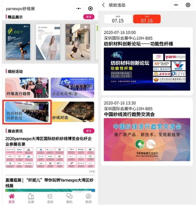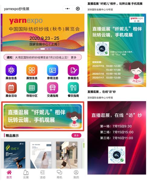 今年5月,yarnexpo纱线展云展首次上线,500+展商、丰富的线上对接活动受到了展商和观众的一致好评。此次2020年大湾区国际纺织纱线博览会将于2020年7月15日在深圳国际会展中心10号馆拉开帷幕,采取“线上线下”的方式,不断突破创新,运用数字化科技将更多的优质展商展品、缤纷活动、商机对接等信息传递到所有人面前。现场与云端同步互动,突破常规展会的时空束缚,打造yarnexpo纱线展云展强劲的辐射力量。 本次纱线展云展小程序将再度升级,从纺织材料创新云论坛、直播逛展、精彩企业分享会、热门展商展品、商机供需发布、展会前沿咨询、精致服务体验这七大块,让您在云端体验双线展会的精彩。 一、直播逛展,带您玩转云端 中国纤维展区将派出中国纤维流行趋势的形象代言——“纤妮儿”,将以小分队的阵容直达企业展位,通过直播逛展的方式,让展商与客户在“云”上相聚。进入“纱线展云展”小程序,点击“直播逛展”栏目,纤妮儿主播将带您走进40+家化纤企业展位、第一时间分享企业主打产品、其性能特点、应用领域等信息。您还可以随时在直播间内实时留言,与展商进行进一步交流。 二、创新纺织材料云论坛,云上直面大咖 今年纤维新视界——纺织材料创新论坛重点关注纺织化纤企业在可持续与功能性方面的新技术、新趋势,来自纺织产业链的近20位嘉宾将围绕环保、健康、功能、差别化等话题做精彩报告。现在你足不出户,只要进入纱线展云展小程序“纺织材料创新论坛”板块,即可同步分享直播论坛盛况,领略展会的高光时刻。 三、精彩企业分享会,直播连连看 一场疫情打乱了市场节奏,更打乱了行业人的推广计划,企业迫切寻找新的推广营销模式。“纱线展云展”的“企业发布会”直播板块为展商提供了展示的平台和机会。企业将携手下游合作伙伴,借助直播平台上演精彩对话,探讨行业热点话题,分享产品研发经验,展示企业创新产品。