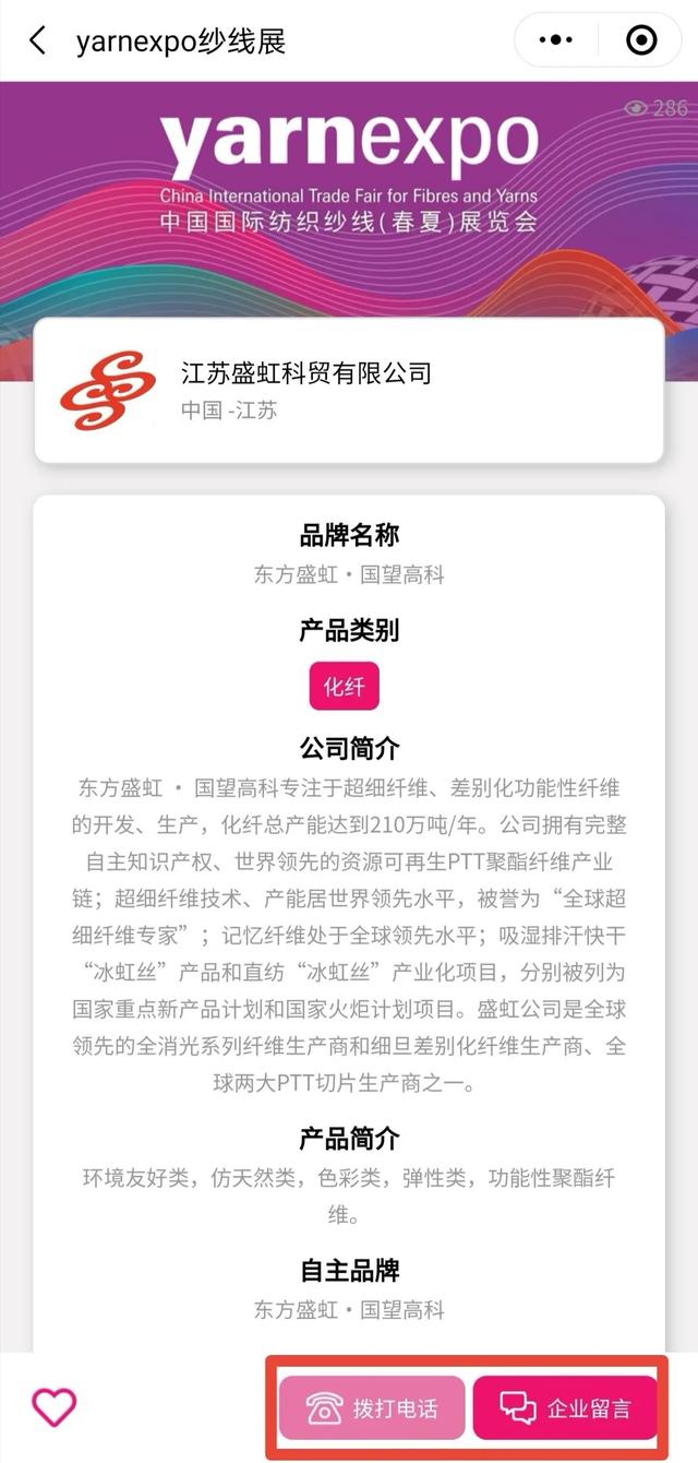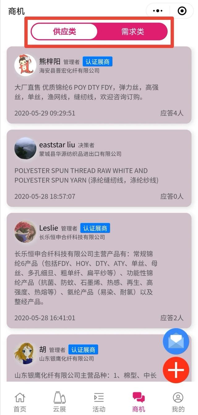 四、商机供需随时发布,热门展商全面对接 “纱线展云展”跨越了时空限制,“纱线展云展”中的“展商”栏目为参展商提供强大的展示平台,这里您可以足不出户就能尽情浏览全部的展商信息。如果您有感兴趣的展商或者展品想进一步交流,云展小程序为您设置了拨打电话&企业留言功能,让您与展商立刻对接。同时您的供求类及需求类信息可以在“商机”栏目里随时发布,同样不会错过火热的商贸氛围。