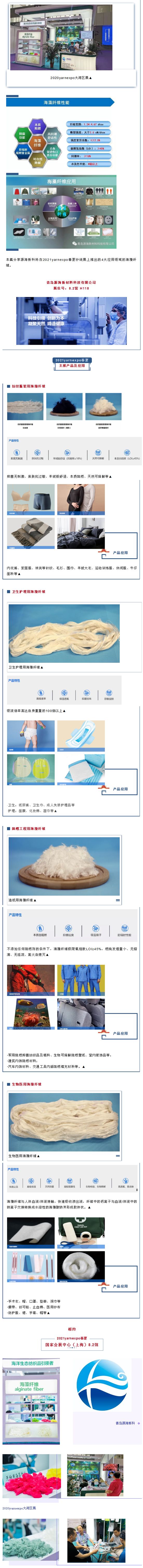 青岛源海新材料科技有限公司 展位号:8.2馆 H118 海藻纤维是以从海洋藻类植物中提取的海藻多糖为原料,经湿法纺丝制得的海洋生物基纤维。 ·纯海藻纤维呈纯白色,表面光滑有光泽,手感柔软且纤度均匀; ·具有良好的吸湿性; ·具有本质阻燃特性,可以离火自熄; ·纤维中含有微量的乳酸或低聚物,有抑菌作用; ·对金属离子有良好的吸附作用,因而具有防辐射功能;