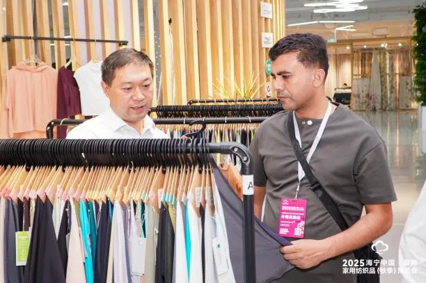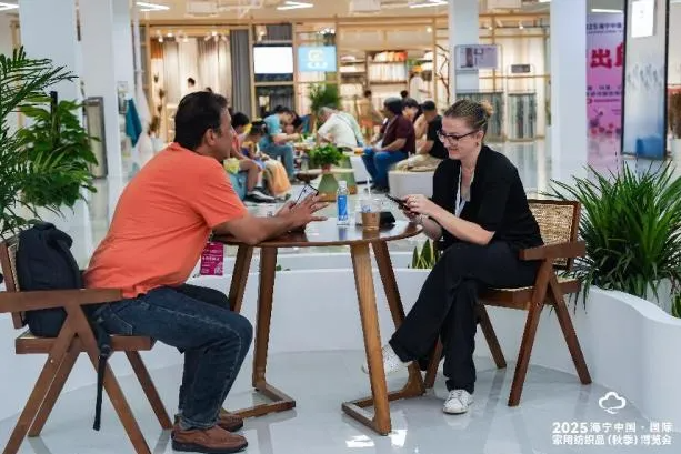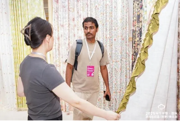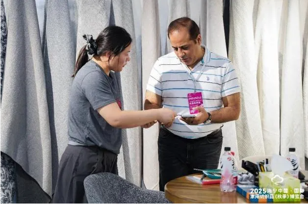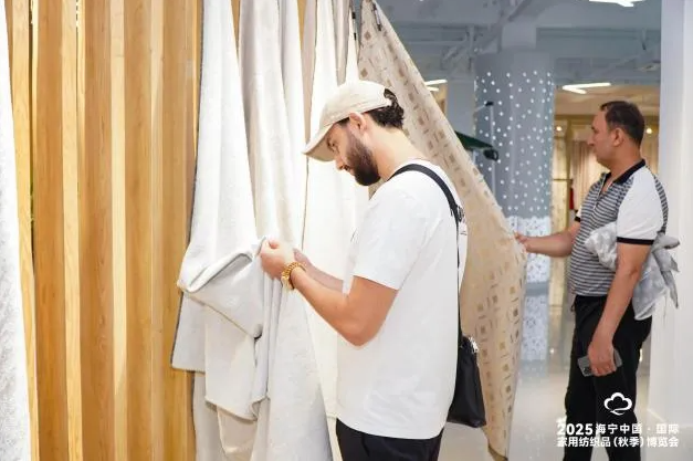 土耳其买家瑞子顼则是个“中国通”,2012年跟着太太回其家乡汉中,后又去过广东江门研究市场,2个月前正式去到义乌开展家纺外贸业务,这次选择来海宁家博会参加“许村优品”家纺外贸对接会,也是同在义乌的外商友人力荐。“义乌的产品价格较低,定位偏向大众化,海宁的产品定位中高端市场,品质更高、设计更有特点,价格看似没有义乌有优势,但懂产品、想要好东西的人能看得懂,也愿意为此买单。比如现场宏达高科的产品我就感觉很不错,有意向继续深度洽谈。”