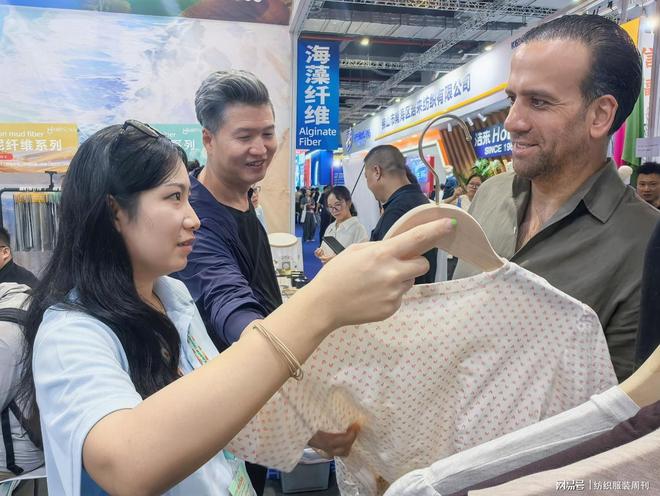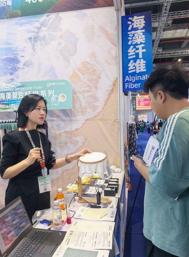 展台洽谈区,围绕“材料创新”的技术交流持续升温。面对某面料企业提出的“功能面料水洗失效”难题,海纤生物技术专家以海藻纤维为例解答:“海藻纤维的抗菌等特性是材料本身自带的功能,而非传统涂层或者助剂,多次水洗后功能仍稳定。”这番讲解让对方当即提出样品测试需求;某快时尚品牌关注“环保与性能平衡”,刘春梅则以海藻纤维的“全生命周期绿色属性”回应:“我们的3万亩海域天然原料 + 低温萃取工艺,降解零污染,还能兼顾阻燃、抗菌,适配碳中和需求。”