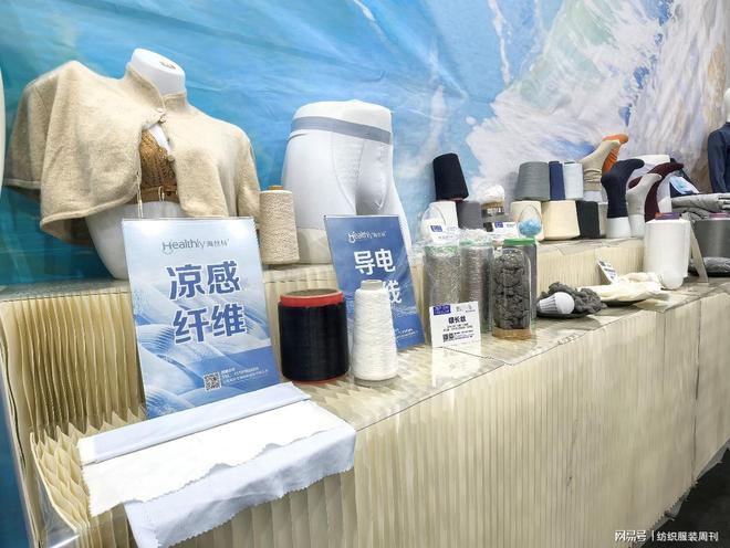 展台现场,针对四大纤维的功能演示成为关注焦点。阻燃测试中,工作人员用打火机接触海藻纤维面料,明火瞬间熄灭且无黑烟熔滴,直观展现“本质阻燃”优势;消臭演示里,异味试剂加入海藻复合纤维后快速消散,让观展商切实感受到“瞬间消臭”效果;银纤维的演示更具吸引力——嵌入银纤维的手环表带不仅能显示抗菌数据,连接导线后还能点亮 LED 灯,清晰呈现导电特性。