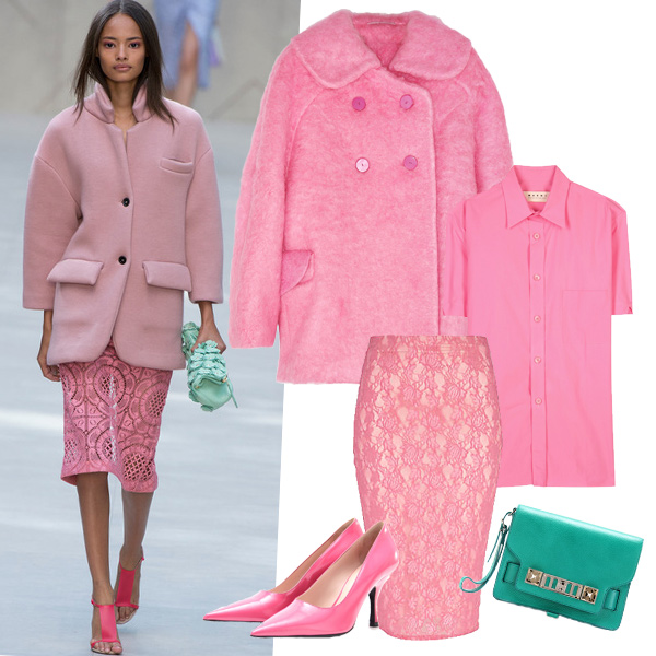 ![]() Burberry2014春夏秀场上无处不在的粉红、粉蓝、粉绿、粉紫等等意味着明年春夏浪漫气息的回归,那为什么不提前将这些美好的色泽带入今秋呢?宽大的圆廓形厚实外套暖意十足又强调将会非常流行的高级定制风格剪裁。蕾丝过膝铅笔裙女人味十足,配上同色系中跟鞋,使易显稚气的粉色多了一丝端庄,不落俗套。不要忘记用薄荷绿的手拿包来营造层次感。 ![]() Christopher Kane的女孩儿们总是青春又怪诞的。在春夏系列中,他巧妙地将套头运动衫与带有“生物课本图片”印花的百褶裙搭配,成就了一个个性十足的文艺look。玛丽珍鞋、小巧手拿包和柔顺的直发都烘托了一种现代淑女气质。