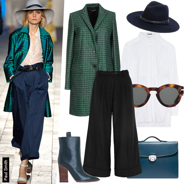 ![]() Paul Smith的春夏系列帅气随性,略带草原风(The Prairie Look)。千鸟格的外套本在今年秋冬就是流行趋势之一,在染上风头正劲的墨绿色,自然是潮流必备。简单的白衬衫、七分阔腿裤和粗跟短靴中性利落。草原风阔边帽、玳瑁墨镜和公文包皆为造型抹上神秘的复古色彩。