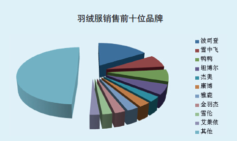 根据中华全国商业信息中心的统计,2015年7月,全国重点大型零售企业羽绒服销售前十位品牌市场综合占有率合计为50.68%,其中,波司登、雪中飞和鸭鸭占据前三位。