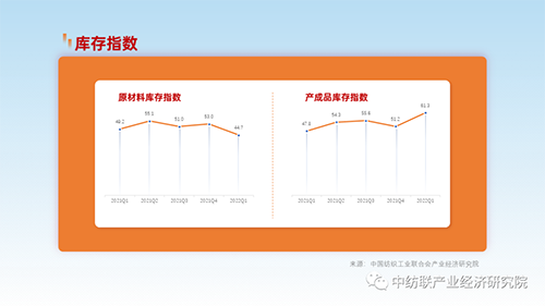 同时,受市场需求不足、物流受阻、部分市场关闭等因素影响,企业产品销售不畅,产成品库存有所上升。据测算,一季度纺织行业产成品库存指数达61.3,较上年四季度增加10.1个点。