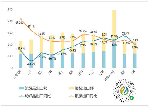在我国外贸发展面临外部环境愈加复杂严峻的形势下,1~4月我国货物出口贸易额同比增长12.5%(以美元计),体现了中国经济韧性强、潜力足、回旋余地广等特点。但自二季度以来,纺织服装行业受多地疫情影响,外贸承受较大下行压力。仅从4月出口表现看,我国纺织服装出口增速(以美元计增长1.6 %)涨幅较3月份回落了15.2个百分点。