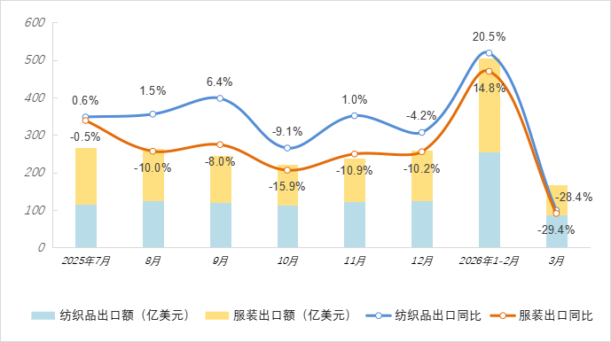 图2 2025~2026年全国纺织品、服装出口月度统计