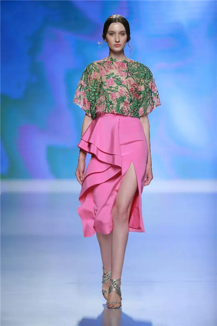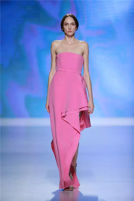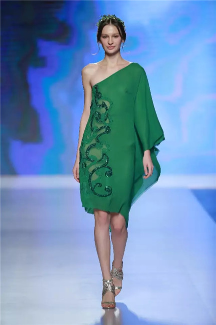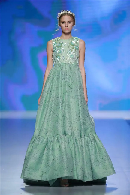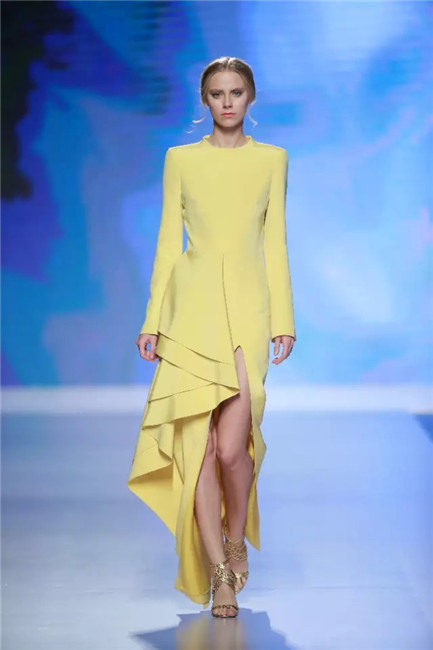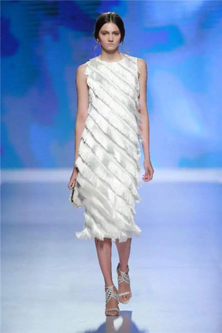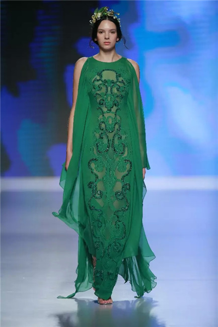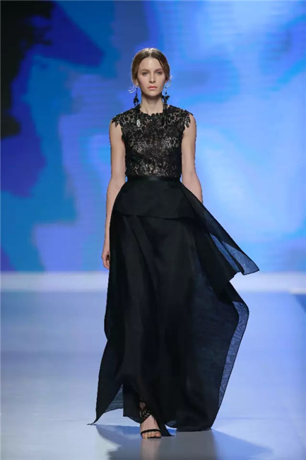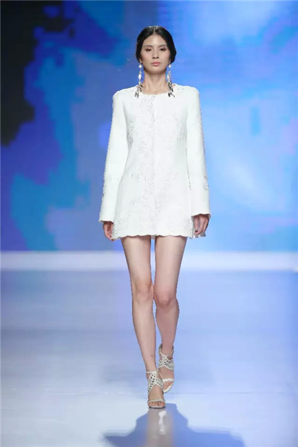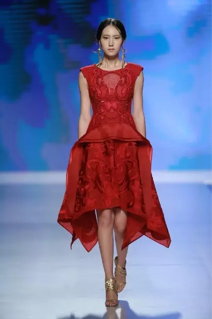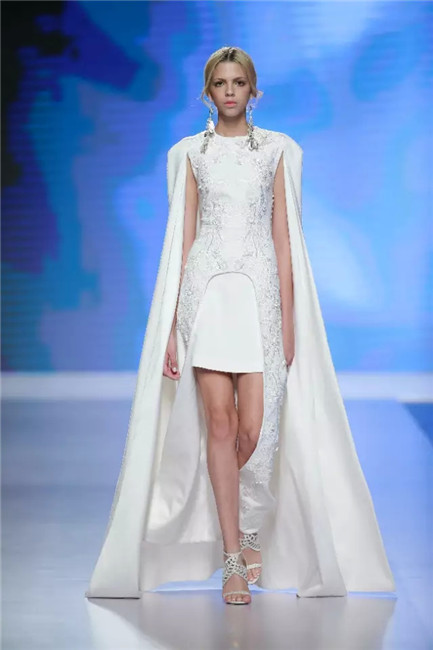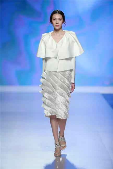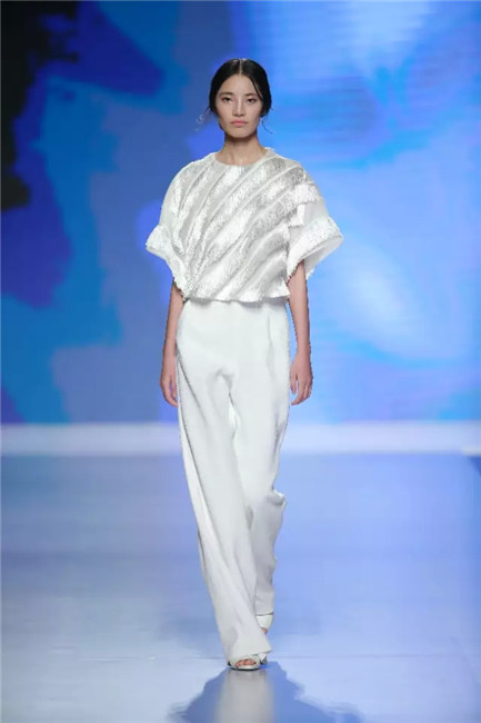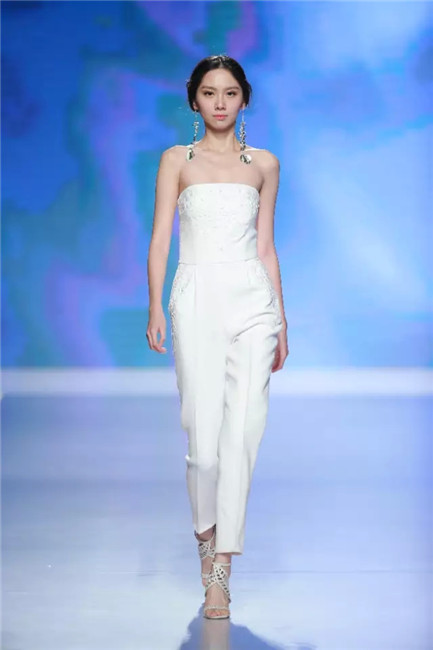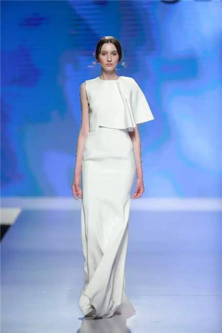 北京国贸大酒店,中国国际时装周闭幕秀,可谓寸土寸金寸光阴,设计师谢锋只带来了定制品牌JEFEN BY FRANKIE的32套作品。不是土豪,而是另有故事——科技改变时尚生活。 开场,纯净的洁白,回归初始。在这场以“伊甸园”为主题的发布中,黑白主色调契合了当前国际上回归经典的流行态度,其间穿插石榴红、青果绿、浅鹅黄等大胆色调,烘托出当日颁奖典礼的氛围。值得一提的是最后的大礼服系列,看似繁复,实则以精准定位刺绣,省去了传统服装的各种破缝线以及结合线,使得整件衣服除了拉链以外,无缝缝合,浑然一体,天衣无缝。