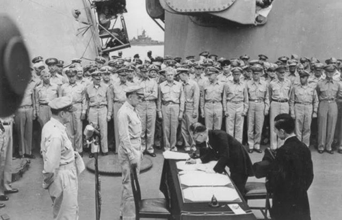 1945年9月2日 日本投降签字仪式在东京湾美国的“密苏里”号巡洋舰上举行 1945年9月2日 日本投降签字仪式在东京湾美国的“密苏里”号巡洋舰上举行。中国抗日战争胜利结束,第二次世界大战胜利结束。日本在投降书上签字的第二天即9月3日被确定为中国抗日战争胜利纪念日。抗日战争的胜利,是中国人民一百年来在反对外国侵略者的斗争中第一次取得完全胜利的民族解放战争,是世界反法西斯战争的重要组成部分。