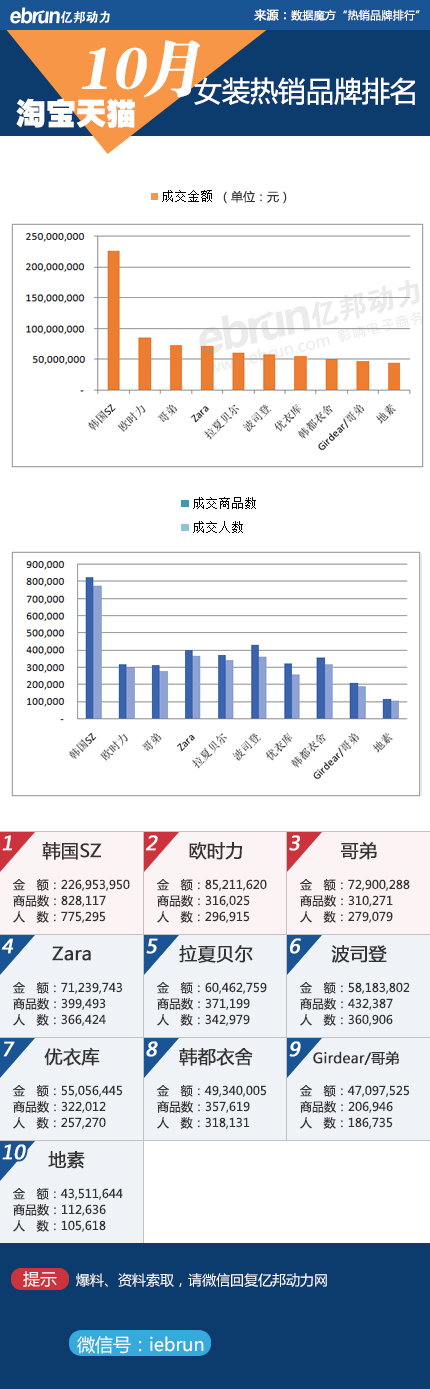韩国SZ在10月售出了惊人的2.26亿,欧时力经历了数月的低迷后上升至第二位,销售额约为8521万元,相比9月上涨了约2000万元。