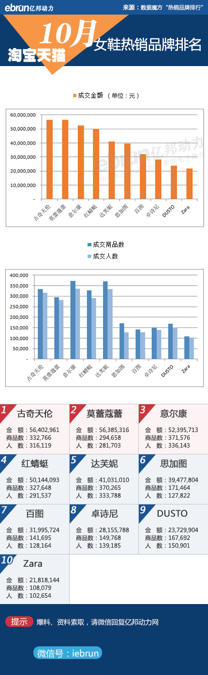 古奇天伦升至第一,销售额达到5640万元,除此之外,莫蕾蔻蕾、意尔康和红蜻蜓10月的销售额也超过了5000万元,其中意尔康10月的销售额上涨了约2500万。