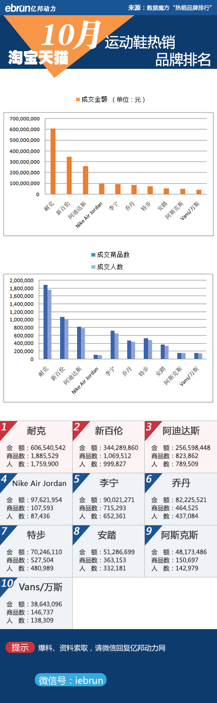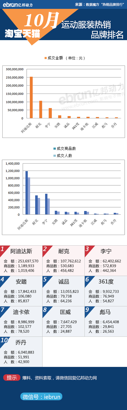 耐克在运动鞋市场一枝独秀,销售额达到惊人的6.06亿,而跑鞋品牌新百伦在10月的销售额也超过了3亿,运动休闲服装类目中销售第一的阿迪达斯排在第三,销售额约为2.56亿元。