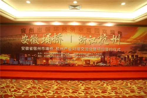 近日,由埇桥区委、区政府主办的2016埇桥区·杭州产业对交流会暨项目签约仪式在浙江省杭州市隆重举行。 宿州市委常委、埇桥区委书记王启荣,中国纺织工业企业管理协会副会长王进军等领导、嘉宾出席会议,会议由埇桥区委副书记、埇桥区人民政府区长张建军主持。埇桥区发改委、经信委、文广新局、商务局、招商局、宿州市循环经济示范园等部门负责人以及杭州、嘉兴等地200余名企业代表也参加了会议。