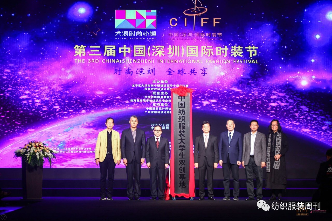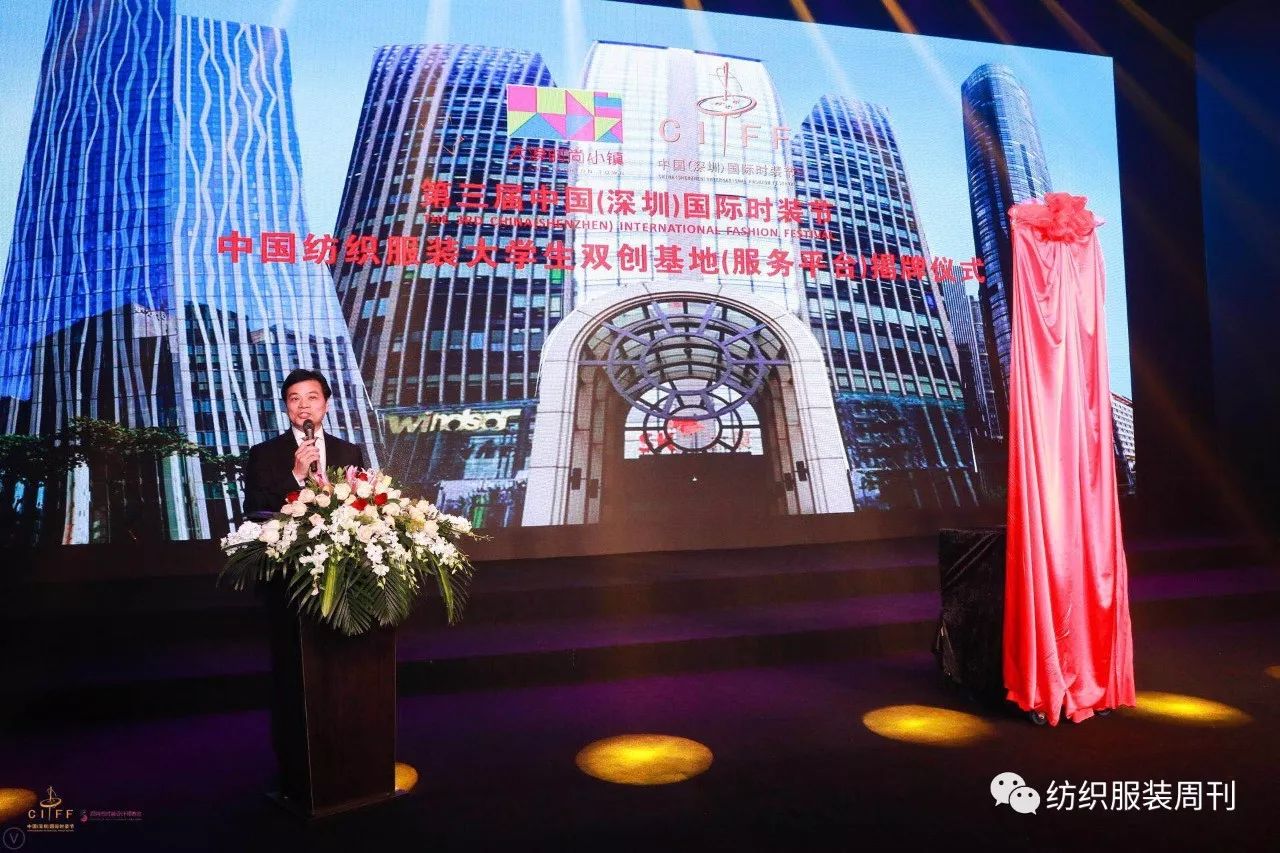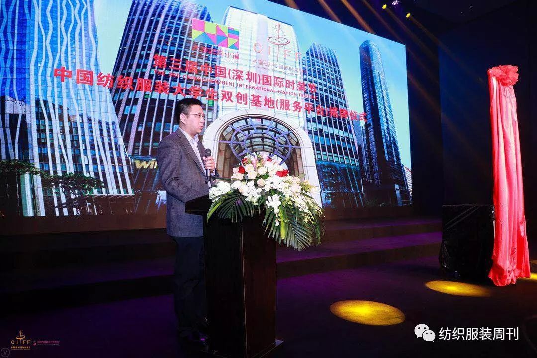 大浪时尚小镇建设领导小组执行副组长仙新民致辞 双创基地开启时尚后援团 本届深圳时装节开幕式上还有一项重要程序,即中国纺织服装大学生双创基地(服务平台)正式揭牌。中国纺织服装大学生双创基地(服务平台)落户深圳,不仅是对深圳时尚产业这么多年来发展的认可,也为深圳时尚教育提供了良好培养后盾。杨纪朝、倪阳生、丁宁、刘岳屏、仙新民、周世康以及各服装院校院长、负责人等共同为中国纺织服装大学生双创基地(服务平台)揭牌。 中国纺织服装大学生双创基地(服务平台)揭牌 人力资源和社会保障局就业促进与失业保险处崔岐平致辞