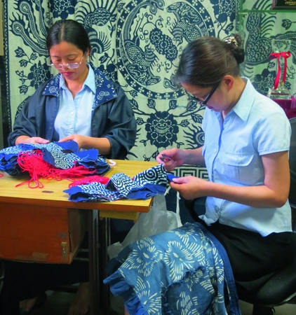 让蓝印花布后继有人 随着国家对非遗保护的重视,吴元新于2006年被评为首批国家级非物质文化遗产项目代表性传承人,也就是在这一年,他应邀走进了清华美院的课堂,给学生们讲授蓝印花布图案艺术,演示蓝印花布生产的工艺流程。2007年1月,吴元新的南通蓝印花布博物馆与清华美院合作建立了“非物质文化遗产传统印染工作室”,在这里,学生们不但可以触摸博物馆里的藏品,还可以用最传统的染料进行印染实践。另外在中央美术学院,有关蓝印花布技艺的课程也已经开设了5年。 “最初报名的学生只有20多人,后来人数不断增加,学校便又加开了多个非遗项目传承课程。”吴元新高兴地说。如今,只要是收到学校邀请,吴元新都会推掉其他事来为学生上课,一方面可以让更多的学生了解传统艺术,同时他也希望从年轻人身上学习到新的理念。 在吴元新的记忆里,上世纪70年代,在他的家乡还有数百人在做手工蓝印花布,但现在掌握这种技艺的只剩下20多人。而充斥市场的用电脑刻板、机器染色的蓝印花布更是使传统手工蓝印花布的生存举步维艰。看到自己创作的蓝印花布图案被大量“盗版”,而市场上大量廉价出售着流水线上生产的蓝印花布产品,吴元新感到无奈。 近年来,随着国家对包括蓝印花布在内的非物质文化遗产越来越重视,让吴元新看到了希望,更让他倍感欣慰的是,在蓝印花布世界里出生长大的女儿吴灵姝和自己一样热爱蓝印花布。就读于北京理工大学设计艺术学院的吴灵姝,作为蓝印花布的第六代传人,现在已经熟练掌握了蓝印花布技艺中刻、印、染以及绞缬、夹缬等传统技法,并立志将来传承父业。 吴元新说,自己最大的愿望就是希望通过自己的努力使蓝印花布未来的路越走越宽。