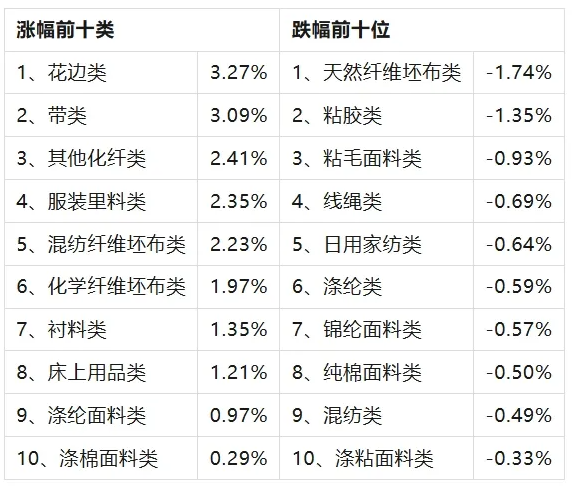 据监测,本期服饰辅料类价格指数收报于130.70点,环比上涨2.13%,较年初下跌0.71%,同比下跌2.41%。其中:花边类、带类、服装里料类、衬料类行情明显推升,价格指数呈一定幅度上涨走势。