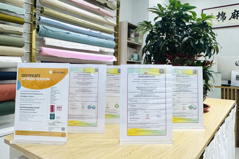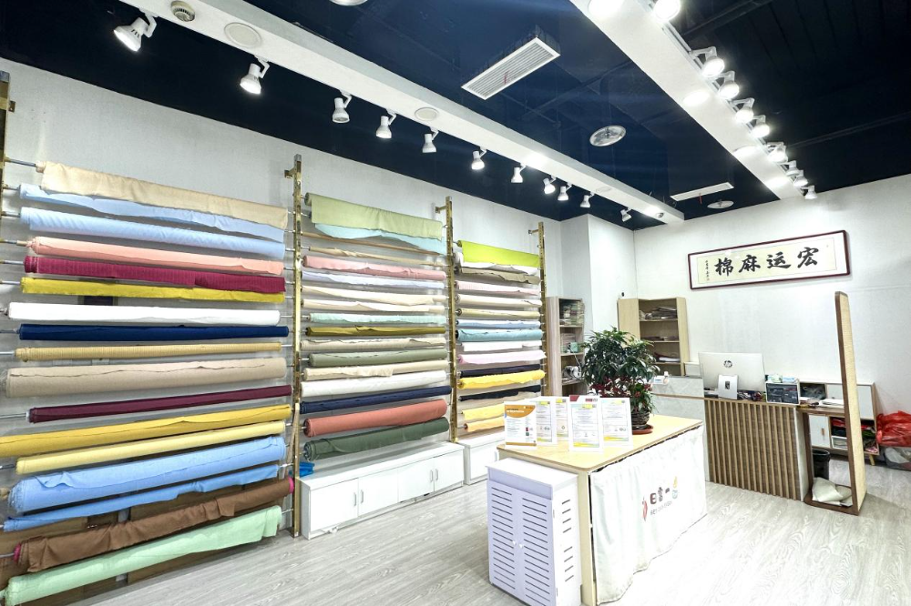 ![]() 走进中国轻纺城联合市场麻类面料专区,“宏运麻棉”门店以整洁专业的形象迅速吸引视线。这家源自江苏宜兴的工贸一体化企业,在柯桥设立进出口公司,专注纯亚麻、苎麻及天丝亚麻、莱赛尔亚麻等混纺产品,并拥有覆盖欧麻全流程的相关认证,以及FSC、GRS、BCI等多项国际体系认证。然而,比门店形象更值得关注的,是其背后完整的产业链布局、持续的研发创新与前瞻性的市场策略。