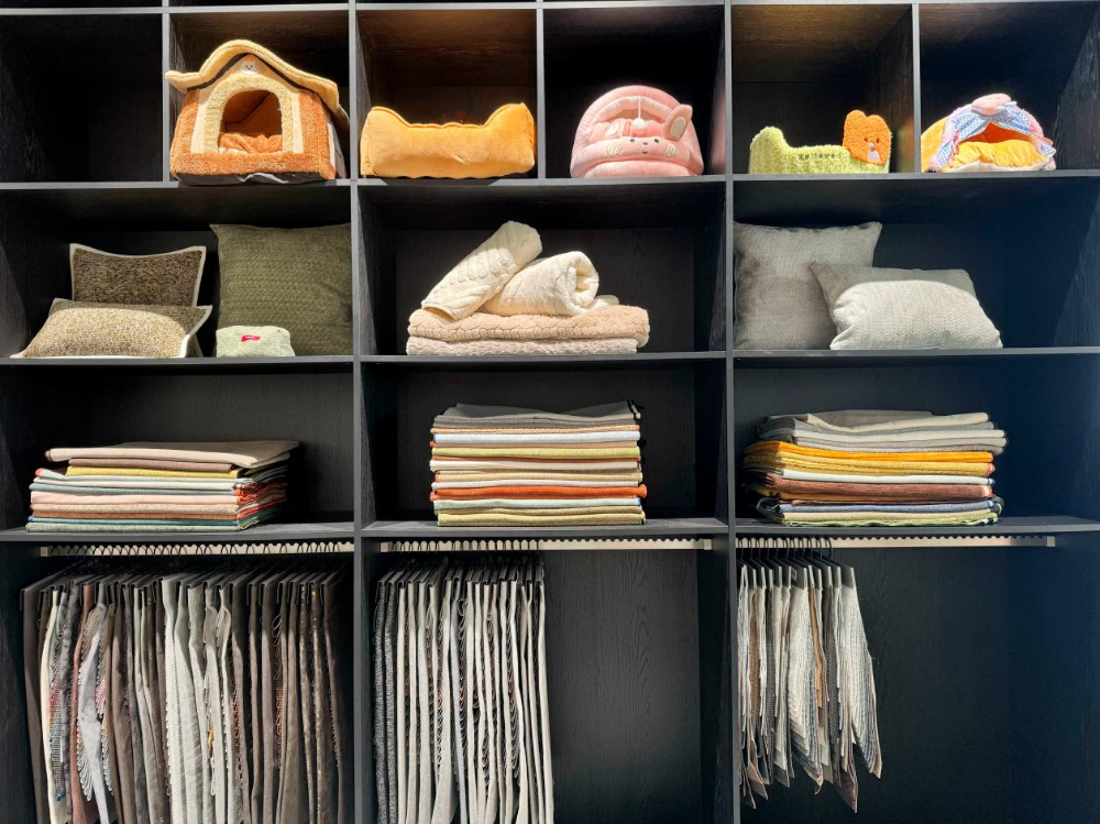 随着养宠观念的升级,人们不仅注重宠物的基础生活需求,更愿意为宠物消费赋予更多审美与设计价值。位于中国轻纺城北市场的哲麦斯纺织以往以汽车座垫面料见长,如今正以其色彩鲜明与质感立体的面料,吸引着越来越多有追求的宠物用品设计师。