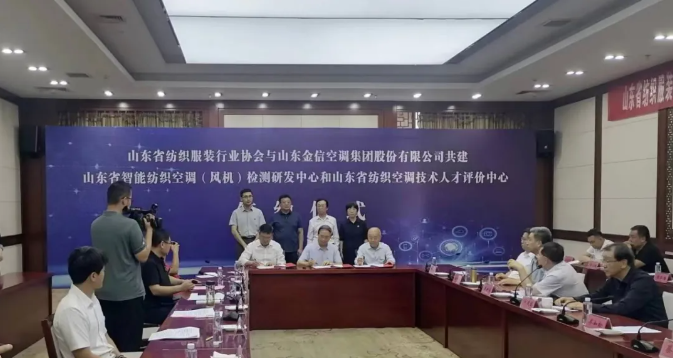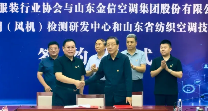 6月16日,山东省纺织服装行业协会与山东金信集团共建山东省智能纺织空调(风机)检测研发中心暨山东省纺织空调人才评价中心签约仪式在德州武城举行。