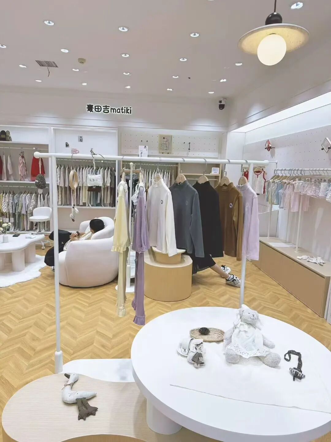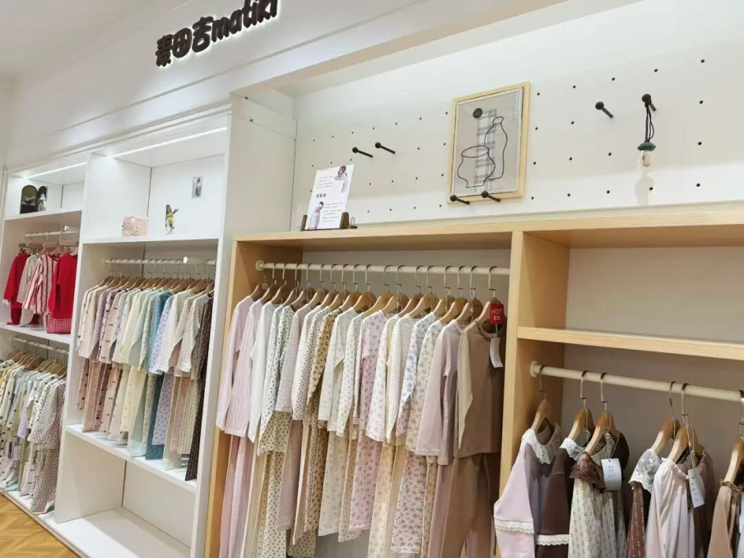 走进麦田吉的陈列区,第一印象是“柔和”。没有刺眼的荧光色,也没有过度装饰,取而代之的是米白、浅咖、雾霾蓝这些低饱和色调,搭配手绘风的小熊、兔子、云朵图案,仿佛把阳光晒过的棉花揉进了衣服里。