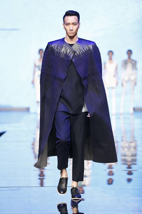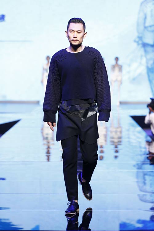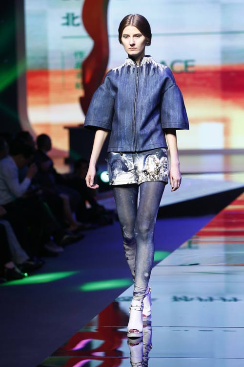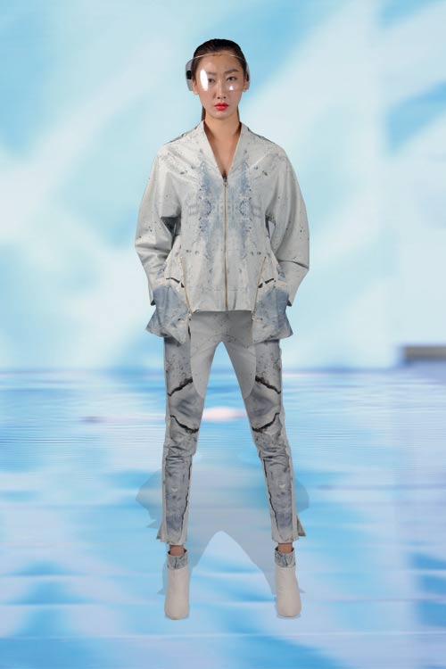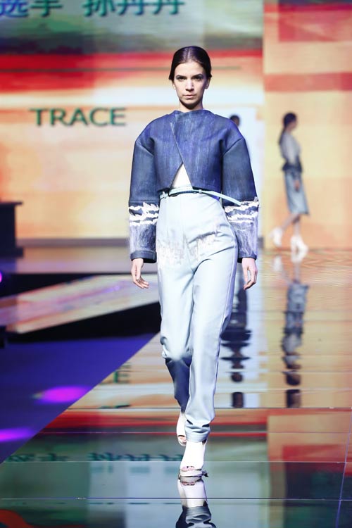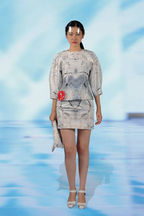 我的作品是《CRACK CORROSION》,灵感主要来源于墙体的裂纹,我认为墙体裂纹可以表达时间的流逝和人们对于墙体的破坏,能够反映出环境破坏的元素,十分呼应本届大赛环保的倡议。通过把这样的图案拼接在一起,希望能够呼吁大家的环保意识。在面料上,作品以数码印花的方式呈现出来。参加本届大赛,我感觉所有参赛选手都特别用心,特别是有些选手在配饰上下了很大功夫,从他们的身上我学到了很多。
