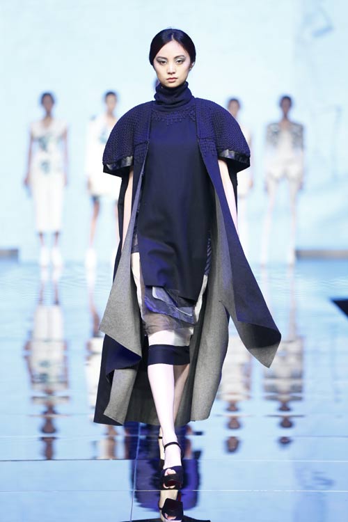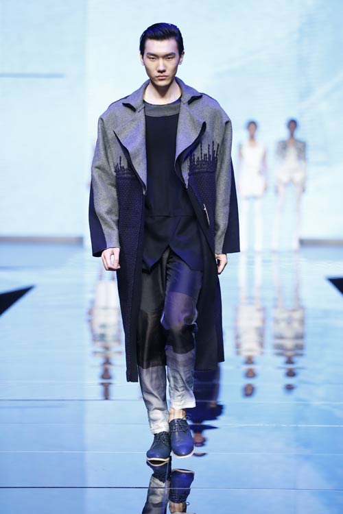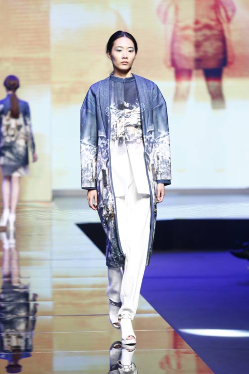 《TRACE》将仿牛仔印花加之于毛呢面料之上,既有看似粗犷、随性的外表又有棉柔、舒适的质感。我认为现在女性追求随性自然,热爱蕴含复古思想的生活状态,所以在面料设计上运用了颜料堆砌的手法,将深浅不同的蓝色看似无序地组合在一起并点缀以金属色,丰富色彩层次,达到视觉平衡,再以转移印花的技术将画作呈现在服装面料上,表达随性不羁的设计理念。除了色彩上出现了金属色,我在服装衣襟和下摆等地方还装饰了废弃的金属工业零件和生活用品,如铜质的插销、螺母等。这些饰品点缀在服装上不仅增加了另类美感,同时也宣扬了都市人废物利用、保护环境的生活新理念。