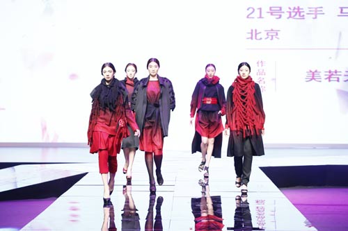 作品《美若天成》的灵感来源于“藤蔓”这种来自大自然的产物,藤蔓枝条蜿蜒、环绕生长的特点给我的设计创作带来了很大的启迪,通过针织、编织和梭织工艺的使用,在色彩上以红色和黑色为主的渐变色调,呼应了大赛“炫梦”的主题,而我的作品也意在展现年轻设计师的梦想,我希望我的梦想就能像藤蔓一样,自由向上地生长,炫出我的梦想。虽然准备的时间很短,但在这短短的几个月内完成属于自己的一套设计作品,意义重大。