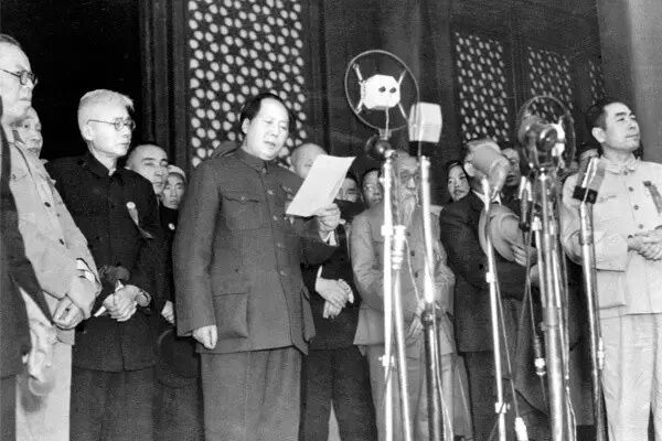 1949年,中国人民政协第一届全体会议开幕,毛泽东身着中山装在天安门城楼上庄严宣告的形象永远地载入了史册。中山装是那个年代最时髦的服饰,比之民国时期的中山装,50年代的“毛制服”将领口开大,翻领也由小变大。