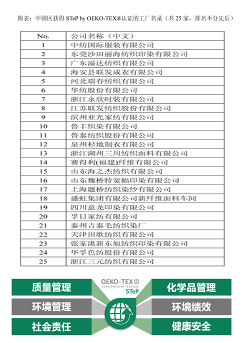 闫妍/文 热烈祝贺华纺股份有限公司和浙江三元纺织有限公司于2017年10月先后斩获STeP by OEKO-TEX®可持续纺织生产认证。截至目前,全球范围内获得STeP by OEKO-TEX®认证的工厂已达142家,其中中国区25家,占比17.6%。
