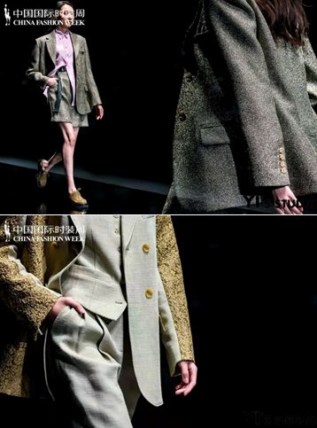 因此,伊雅谋求在本季作品中让设计忠于功能与材料本身,用最朴素的语言创作出日常的、实用的,令人想靠近、想触摸,彰显衣着简约舒适的服装作品。单一朴实的色彩与柔和的配色方案成为极简主义风格的体现,贴近自然偏中性的大地色系成为主打色彩,点缀少量的荧光紫和粉色;而在材质的选择上,天然羊毛纤维面料与新型科技感面料被大量混合使用,强调服装舒适性触感和质感的同时表达消费领域崇尚自然与科技创新带来的矛盾统一;在款式上,关注人体与服装廓型的协调关系,重点突出西装和风衣类单品,通过成套的内外搭配体现作品的完整性;设计手法上遵循“否定、减少、净化”的思维,去除一切不必要的繁复装饰,用最少最统一的方式体现少即是多的完整感;刺绣、拼贴或拨纱等独特的细节设计,彰显出传统的奢侈品质,进而将高级时装的体验感带入日常装。