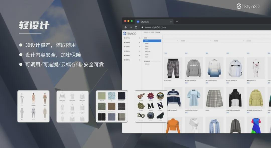打造服装全链路数字化 Style3D柔性体仿真技术在纺织服装行业的创新应用主要体现在三个方面: 助力研发方面,Style3D能够帮助服装设计师实现快速设计,从面料数字化、3D设计、3D改版、审款、云端协同定样、直连生产等打造研发全链路的数字化流程,而这其中,每个环节的数字资源都可沉淀为企业可视化、可追溯、云加密的数字资产,实现随时调用和二次研发,加速研发效率提升。 ![]() ![]() 由Style3D制作的数字服装