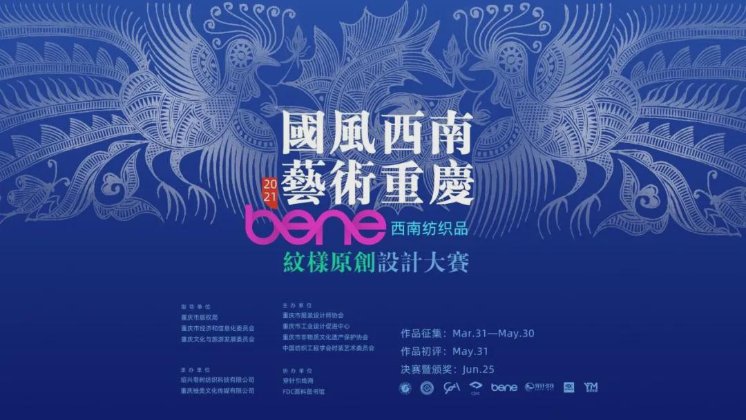 2021bene西南纺织品纹样原创设计大赛由重庆市版权局、重庆市经济和信息化委员会、重庆市文化和旅游发展委员会指导,由重庆市服装设计师协会、重庆市工业设计促进中心、重庆市非物质文化遗产保护协会、中国纺织工程学会时装艺术委员会共同主办,由浙江本一科技有限公司及重庆柚美文化传媒公司承办。