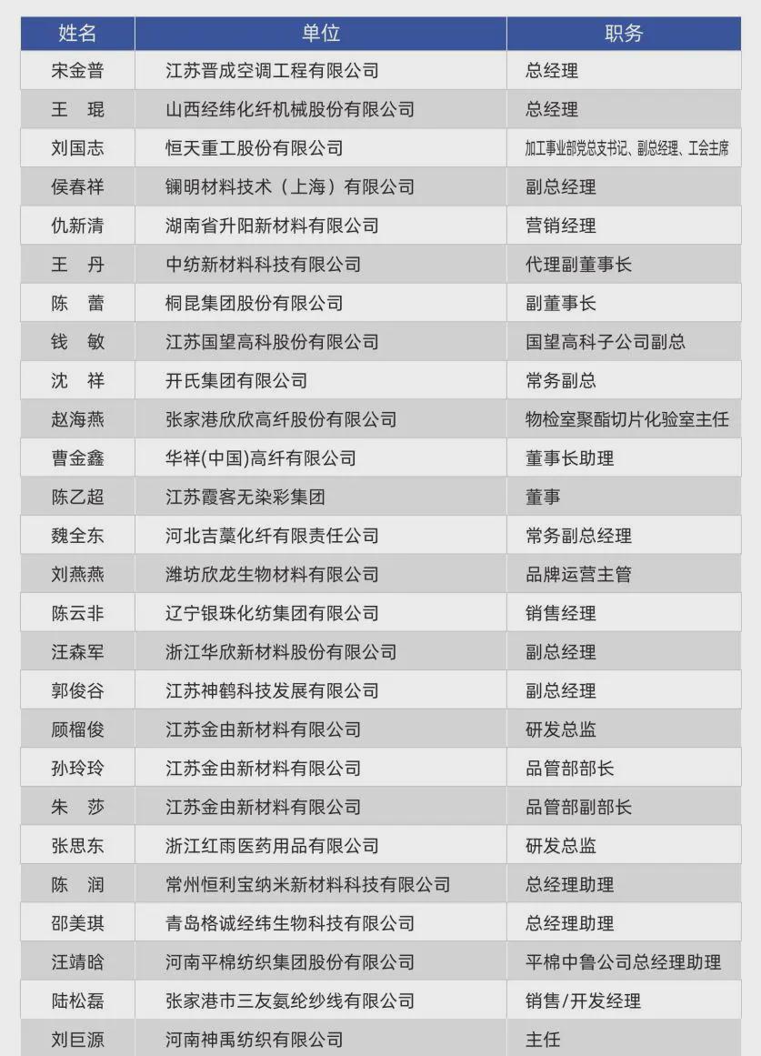 第六期纺织高训班约有40多名学员,覆盖产业链上下游各环节,平均年龄35岁,将为纺织高训班带来观点的碰撞、无限的活力和丰富的创意。 本期学员名单 ![]() ![]() 纺织高训班由中国化学纤维工业协会、中国纺织工程学会、中国纺织工业联合会科技发展部、中国棉纺织行业协会、纺织人才交流培训中心、北京服装学院共同组织主办,自2015年开班至今,其已经形成从纺织原料到机械设备、从纤维生产到纱线织造、从面料研发到终端品牌的完整的产业链教育体系,成为纺织全产业链交流信息、提升技术、共享资源、展望趋势的大平台,对促进企业发展、推进纺织产业链的融合起到积极作用。