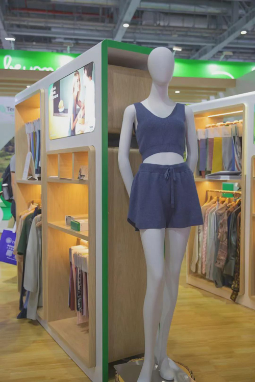 本届展会上,兰精集团着重展示了取材可持续天然木源的零碳天丝™莱赛尔纤维和零碳天丝™莫代尔纤维的各类应用。零碳天丝™纤维完全源自于植物,100%生物基,可再生,可生物降解,不仅具备了标准天丝™品牌纤维的功能优势,包括亲和肌肤、持久柔软、触感顺滑、有助透汽和色泽稳定等,更是获得了国际Carbon Neutral™认证,成为遵循全球“CarbonNeutral™碳中和协议”的最严格准则的净零碳排放产品,具备更高的环保价值。