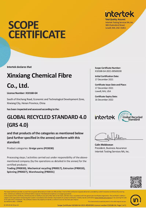 近日,新乡化纤股份有限公司荣获氨纶GRS认证证书,继续保持再生纤维素长丝RCS认证证书。这标志着公司拥有氨纶、再生纤维素长丝两大系列产品再生生产的资质,可以向顾客提供有TC证明的再生产品。同时,公司再次通过FSC林产品产销监管链认证,证书有效期至2026年。 ![]() ![]() ![]() 全球回收标准(GRS)是一项国际、自愿和全面的产品标准,规定了回收内容、产销监管链、社会和环境实践以及化学品限制的第三方认证要求。GRS的目标是增加产品中回收材料的使用,并减少或消除其生产所造成的危害。通过GRS认证,有助于新乡化纤提升核心竞争力和品牌形象。2020年底,新乡化纤建造了一条独立的氨纶再生纺生产线,将回收的氨纶废丝经过溶解等工艺,再制成优质的氨纶成品。既实现了废物回收再利用,又减少了生产过程中化学品的使用。