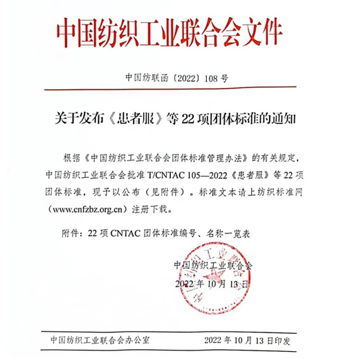 根据《中国纺织工业联合会团体标准管理办法》的有关规定,中国纺织工业联合会于2022年10月13日批准发布T/CNTAC 105—2022《患者服》等22项中国纺联团体标准,标准编号、名称及实施日期等信息见下表,标准文本请上纺织标准网(www.cnfzbz.org.cn)“CNTAC标准工作平台”注册下载。
