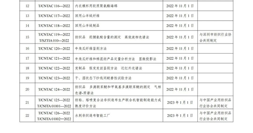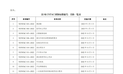 此次发布的22项CNTAC团体标准,T/CNTAC 105—2022《患者服》和T/CNTAC 106—2022《医用床上用品》为跨领域使用产品标准,T/CNTAC 117—2022《回用山羊绒纤维》等2项为回用纺织产品标准,T/CNTAC 126—2022《水刺非织造布智能工厂》等2项标准为纺织智能制造标准,T/CNTAC 107—2022《汉服着装指南》与2020年发布的T/CNTAC 58—2020《汉服》配套使用,T/CNTAC 109—2022《抗氧化针织内衣》等4项标准为功能性纺织产品标准。另外,T/CNTAC 119—2022《纺织品 羟脯氨酸含量的测定 高效液相色谱法》等3项标准由中国纺联与有关行业协会共同制定。T/CNTAC 108—2022《国内外纺织品限制物质要求》给出了世界各主要国家和地区现行有效的法律、法规和强制性标准等对纺织品中的限制物质、限量要求和测试方法,可供有关方面参考使用。