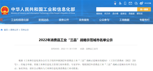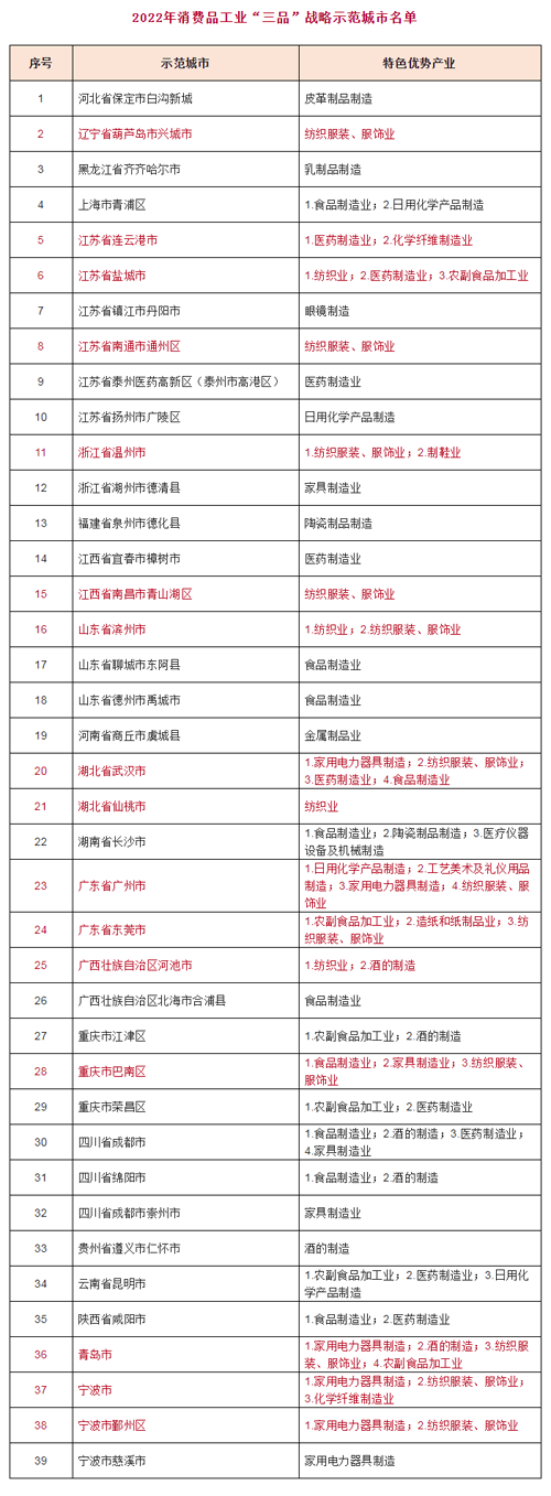 11月30日,工信部消费品工业司发布2022年消费品工业“三品”战略示范城市公示名单,39个城市上榜,其中包括一批以纺织服装为特色优势产业的城市。