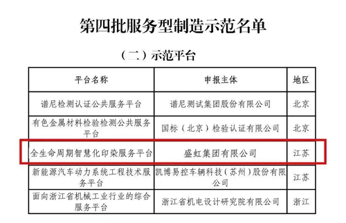 2022年12月28日,工信部发布了第四批服务型制造示范名单。盛虹集团有限公司自主研发的“全生命周期智慧化印染服务平台”入选名单,被评为国家级服务型制造示范平台。这是“盛虹智慧印染平台”获得的第二个国家级荣誉。