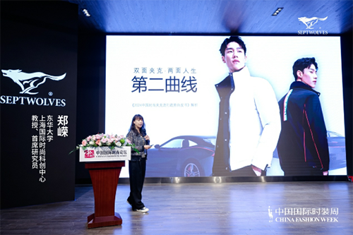 启动仪式之前,作为白皮书策划团队的重要成员之一、东华大学上海国际时尚科创中心教授、首席研究员郑嵘以“双面夹克,两面人生,第二曲线”为题发表演讲,并介绍《2024中国时尚夹克流行趋势白皮书》的最新研究成果。她表示,这份白皮书是首次以“双面夹克”为独立概念发布的流行趋势白皮书,由中国服装设计师协会集结中国美术学院、东华大学、浙江理工大学、中国时装设计“金顶奖”获奖设计师团队等多方学术及创意力量共同创作而成。成书期间,编辑部对当代大学生展开调研,将Z世代设计师对时尚的理解与多元化表达糅合于内容当中,展现出年轻一代对男装时尚的深刻理解和敏锐洞察。 另外,还针对其他年龄段消费者的穿着行为、穿着喜好、穿着意愿展开广泛调研,了解到他们对于多场景穿搭的需求,将双面可穿的夹克作为趋势解析重点单品,全景式展现中国夹克发展趋势。