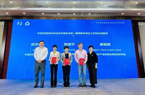 中国家用纺织品行业协会会长、中家纺团标委主任委员朱晓红、江苏省纺织产品质量监督检验研究院院长张彤为中家纺团标委第一届团体标准化工作突出贡献奖获得者颁发证书。