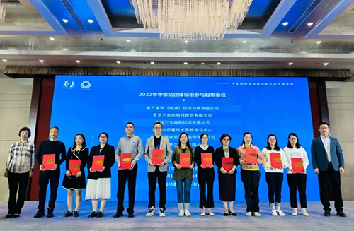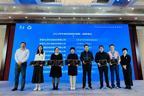 ![]() 中国家用纺织品行业协会会长、中家纺团标委主任委员朱晓红、江苏省纺织产品质量监督检验研究院院长张彤为2022年中家纺团体标准第一起草单位代表颁牌。