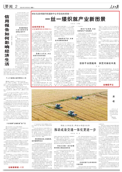 5月20日,《人民日报》要闻2版以《国家先进功能纤维创新中心背靠纺织重镇——一丝一缕织就产业新图景》为题,报道了由盛虹控股集团牵头组建的国家先进功能纤维创新中心。文章从国家先进功能纤维创新中心开展关键共性技术研发、完善技术创新供给体系、加速创新链和产业链融合三个方面,详尽阐述了国家先进功能纤维创新中心如何通过科技创新推动新材料应用快速迭代。