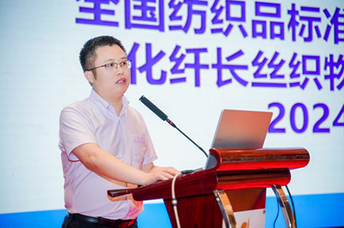 ![]() 全国纺织品标委会化纤长丝织物分会秘书长伍冬平进行了化纤织物产品标准宣贯,介绍了化纤长丝织物标准化基本情况、标准制修订要求、标准化工作效益、长丝织造标准化四个方面。