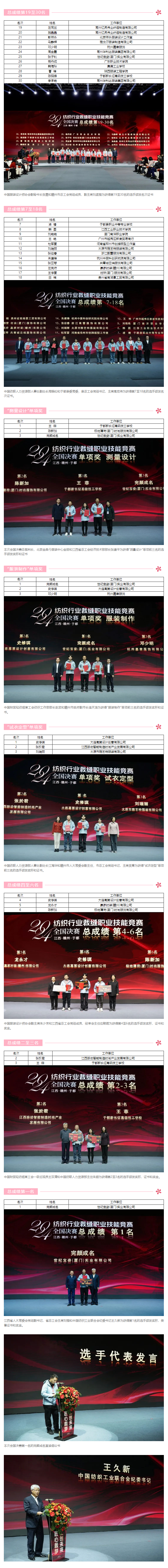 职业技能竞赛作为技能人才培育的重要平台,正日益发挥其独特作用。该类竞赛不仅显著提高了参赛者的个人技能水平,而且促进了行业内的技术交流与创新思维的激荡,更为行业整体发展注入了新的活力,推动了技术进步和产业升级。 12月21日,为期三天的2024年纺织行业裁缝职业技能竞赛全国决赛在江西省赣州市于都县隆重举行。经过激烈的角逐,本次大赛评选结果揭晓,全国前三十强脱颖而出。在单项奖方面,“测量设计”、“服装制作”、“试衣定型”三个项目分别评选出三名获奖者。此外,大赛还设有铜奖三名、银奖两名以及金奖一名。来自世纪宝姿(厦门)实业有限公司的完颜成名获得本次全国决赛总成绩第一名!