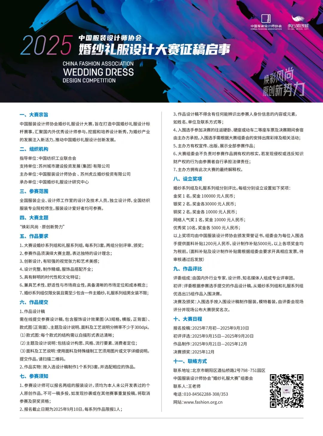 ![]() 为引领中国婚纱礼服设计创新,推动婚纱礼服产业高质量发展,2025年7月9日,由中国服装设计师协会与苏州虎丘婚纱投资有限公司联合主办,中国纺织工业联合会指导、苏州城市建设投资发展(集团)有限公司支持的中国服装设计师协会婚纱礼服设计大赛(CFA婚纱礼服设计大赛)启动仪式在京隆重举行。作为聚焦婚纱礼服设计创新的国家级权威赛事,本届大赛以“焕彩风尚·原创新势力”为主题,旨在通过汇聚全国婚纱礼服设计力量,培育设计新生代,全面推动中国婚纱礼服产业向原创化、时尚化、国际化发展。