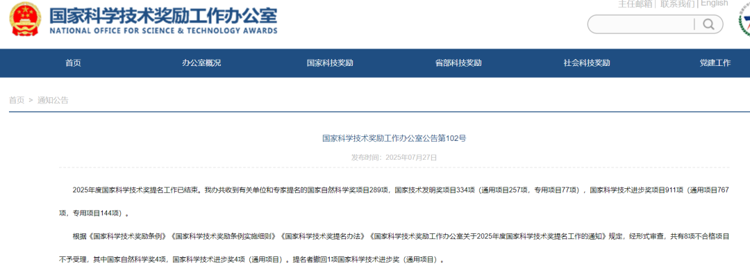 ![]() 根据《国家科学技术奖励条例》《国家科学技术奖励条例实施细则》《国家科学技术奖提名办法》《国家科学技术奖励工作办公室关于2025年度国家科学技术奖提名工作的通知》规定,经形式审查,共有8项不合格项目不予受理,其中国家自然科学奖4项,国家科学技术进步奖4项(通用项目)。提名者撤回1项国家科学技术进步奖(通用项目)。