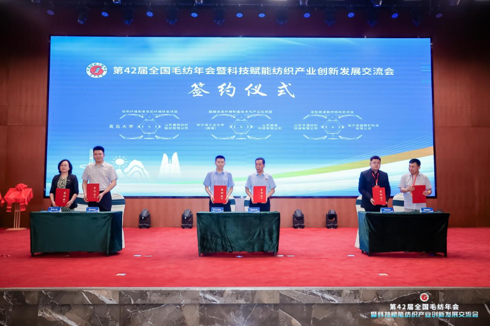 ![]() 会上举办了产学研科研成果转化合作签约活动。青岛大学教授曲丽君、山东盛和纺织股份有限公司经理郭奇、哈尔滨工业大学(威海)教授张涛、山东闻道科技有限公司总经理李因果、山东华澳纺织科技有限公司总经理牟哲奕、临沂成盛精机制造有限公司总经理叶顺果上台签约。